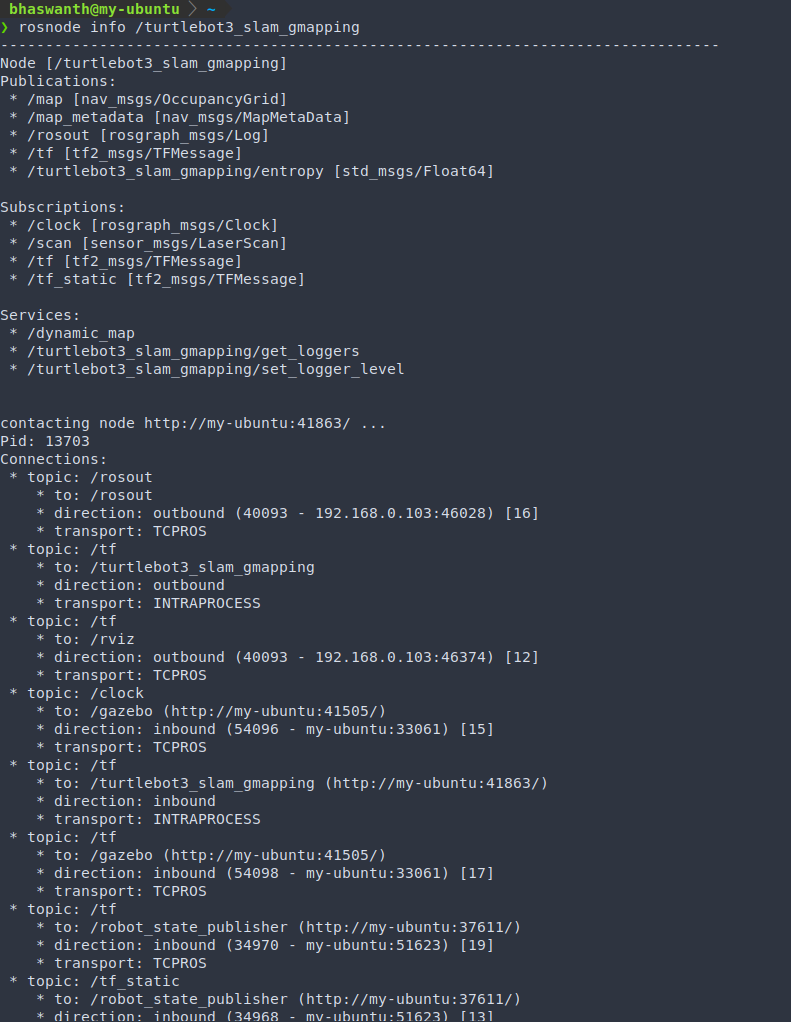 - The turtlebot3_slam_gmapping node subscribes to the Laser topic (/scan) and Transform topic(/tf) to get laser and odom data from the robot, which it needs to build the map.