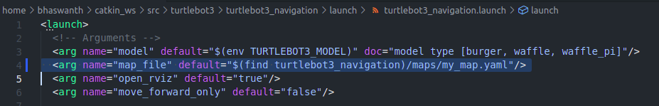 - We now need to make a few small changes to a previously existing launch file. To do so, first go to the ROS directory - turtlebot3_navigation, and open the launch file- turtlebot3_navigation.launchpresent under the- launchfolder.![]()