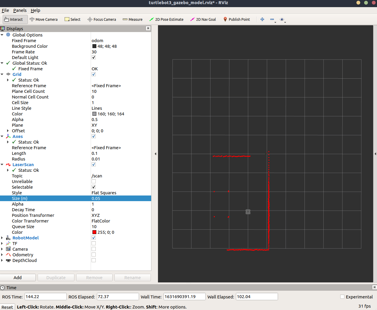- In order to visualize this map on Rviz, enter to following command: - roslaunch turtlebot3_gazebo turtlebot3_gazebo_rviz.launch